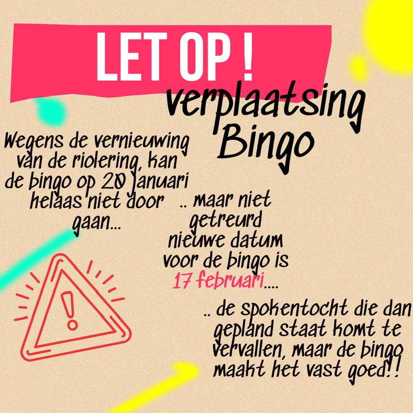 De geplande bingo op zaterdag 20 januari kan helaas niet doorgaan. De toegangsweg naar het dorpshuis is opgebroken en daardoor is het dorpshuis vrijwel niet toegankelijk.
