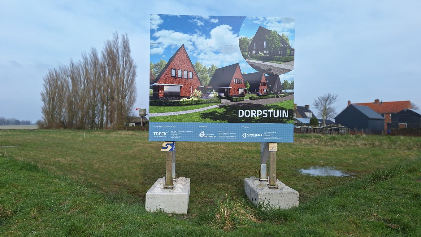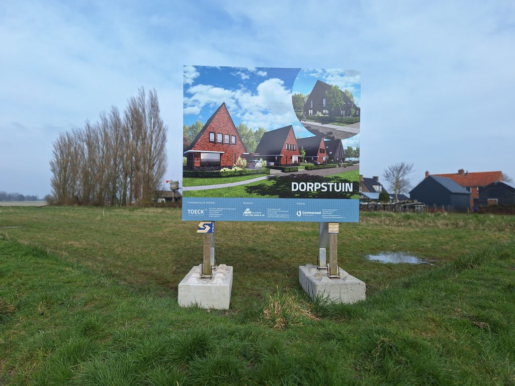 Groot bord kondigt de nieuwbouw met dorpstuin aan.