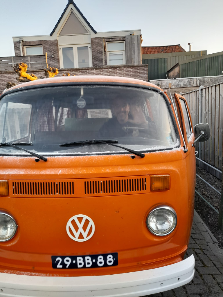 Durk is een vervent sleutelaar aan oude VW’s. Met een geleend busje is het bruidspaar met hun kinderen naar de trouwlocatie, Dorpshuis De Utwijk in Nij Altoenae gereden.