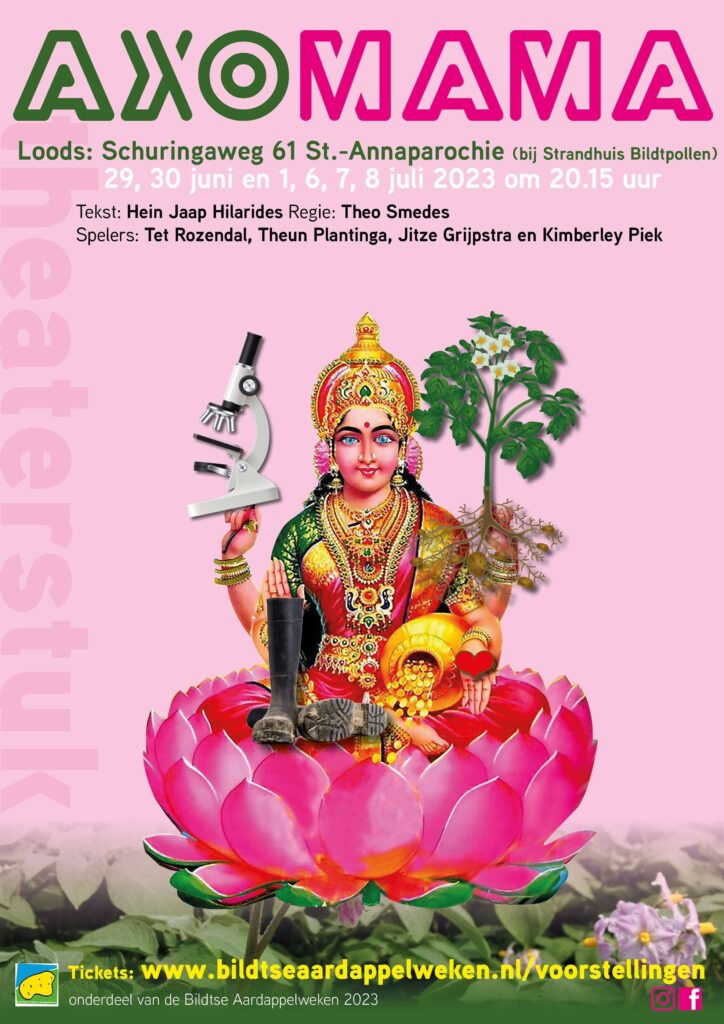 Axomama is de godin van de aardappel. Maar de godin gedraagt zich soms als een mens. Uit jaloezie verandert zij een veredelaar in een aardappel. Maar juist door haar menselijke trekjes weet Axomama het verhaal ook tot een goed eind te brengen. Zij koppelt een jonge boerin aan een boer. En zij tovert de veredelaar terug in een man. Het laat zich raden dat zij hem op zichzelf verliefd laat worden.